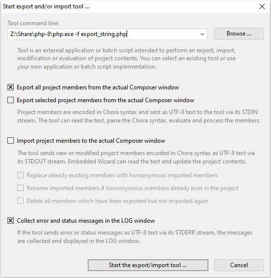The actual export/import operation is carried out by an external tool, which can be a Windows executable, command line tool or just a script written in your preferred language. In any case, when using this feature Embedded Wizard starts the external tool and provides it with all project contents intended for the export. The project contents are encoded as text in Chora syntax. The tool can thereupon process this text and depending on the purpose of the tool, extract interesting project parts, transcode them in other formats, etc.