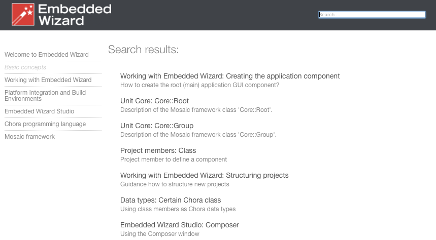 The entire Embedded Wizard documentation is going to be reworked. As a result, the different separate documents (Embedded Wizard User Manual, Chora Reference Manual, Mosaic Reference Manual, Tutorial, HowTo-Documents,…) will be completely reworked and integrated into one all-embracing knowledge base.