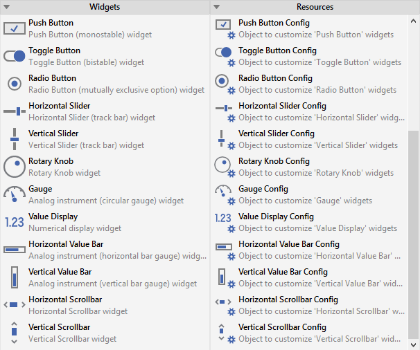 The new Gallery folder 'Widgets' contains the templates to create an instance of a widget. The Gallery folder 'Resources' contains the templates to create configuration objects.