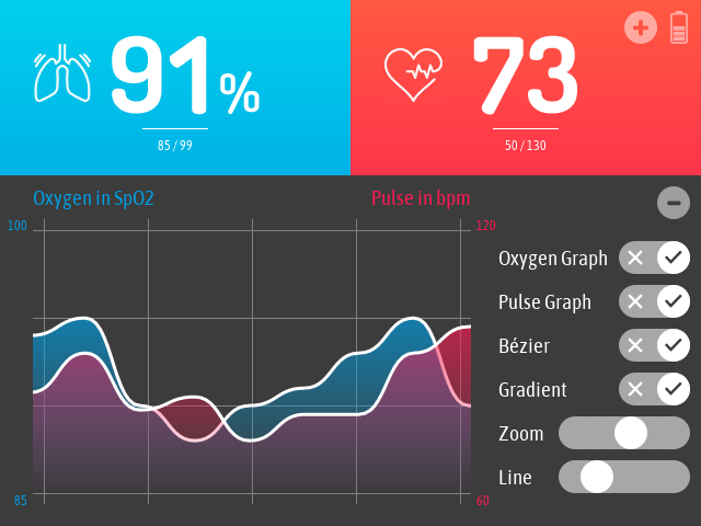 ★PulseOximeter - This sample application shows the implementation of a medical device for monitoring a person's pulse frequency and peripheral oxygen saturation. The application demonstrates the usage of vector graphics within graphs and circular gauges. The data of the pulse oximeter application is accessed via a Device Interface class.