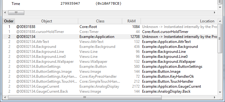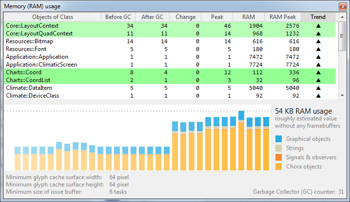 ★New window Memory (RAM) usage replaces the old 'Garbage Collector' window. The new window tracks the memory usage of the entire application. In the upper area the window lists all Chora object classes and their memory (RAM) usage. In the lower area, it displays the estimated total memory (RAM) usage of the tested application as a bar chart. The chart reflects the amount of memory needed by the application within the real target device: