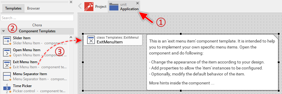 To create a new Exit Menu Item component from a template you simply Drag & Drop it between the Templates window and the Composer with an opened unit. This is important in that by using the component templates you add in fact a new class to your project. Classes, in turn, can exist within units only. The following are the typical steps to create a new Exit Menu Item component from a template: