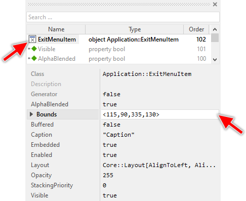 As long as the Exit Menu Item is selected you can inspect and modify its properties conveniently in the Inspector window as demonstrated with the property Bounds in the screenshot below. This is in so far worth mentioning as diverse features of the Exit Menu Item are controlled by the corresponding properties. If you are not familiar with the concept of a property and the usage of Inspector window, please read first the preceding chapter Compositing component appearance.