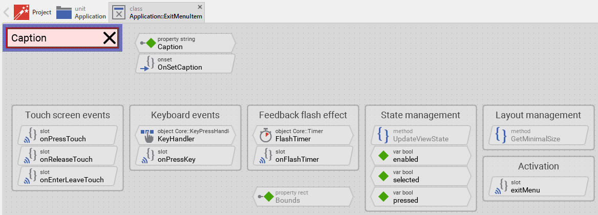 Component templates are intended to create widgets which can be adapted and enhanced to your particular design expectations. For this purpose, once you have added a new Exit Menu Item component to your project, you can open the component class for editing. Thereupon the implementation of the component appears in a new Composer page: