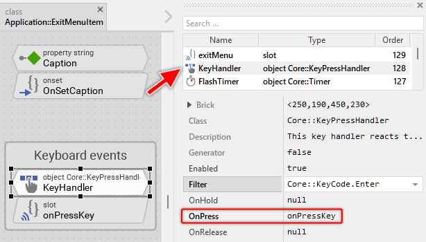 The Exit Menu Item is an interactive component. It can be controlled via keyboard or hardware buttons. For this purpose the template contains the Key Press Handler object named KeyHandler. To this handler is associated the slot methodonPressKey. The method is thus invoked when the user presses the key matching the filter condition specified in the handler object. This is per default the Enter key: