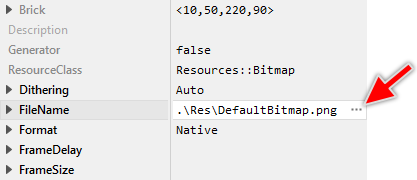 To inspect or modify the value of an FileName attribute, select first the affected bitmap resource member. Thereupon, the attribute is listed in the middle area of Inspector. Please note the available file selection assistant you can activate by clicking on the button
