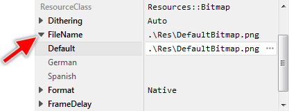 The attribute FileName can be localized allowing the creation of bitmap resource members with language dependent images. For this purpose expand the attribute by clicking on the small triangle left to the attribute. All available language specific values are listed thereupon below the attribute and can be modified individually: