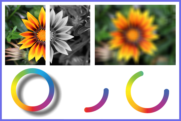 The Mosaic class Views::FilterImage implements a graphical object specialized to display an image with additional filter effects applied on it. This so-called Filter Image view can be used to compose the appearance of a GUI component, in particular to enrich the component by sophisticated filter effects, like blurring, masking, color tinting or shadowing. The following screenshot demonstrates examples of how Filter Image views appear in the canvas area of Composer (and accordingly on the screen in your target device). The example uses the Filter Image to grayscale an image, to blur it, display a shadow of the image and mask it: