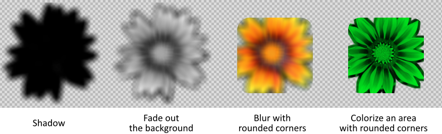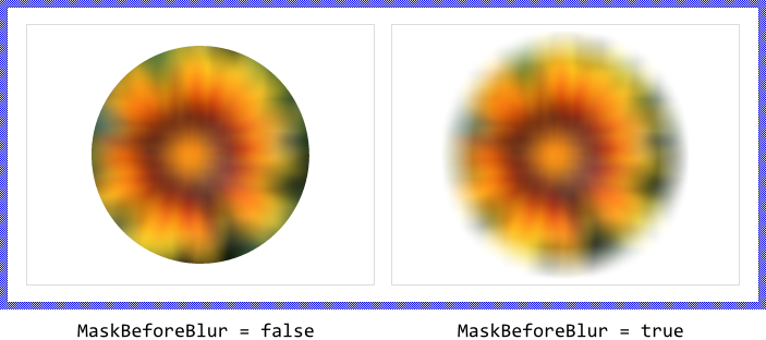 If you intend to combine the mask and the blur filter effects together, note the right order in which the effects are applied. Per default the mask effect is applied after the blur is done. Consequently, the blurred contents appear masked which results in sharp edges according to the shape of the mask. If your application case requires the image content to be masked first and then the resulting masked image being blurred, set the property MaskBeforeBlur to the value true. The following figure illustrates the different results depending on the initialization of the MaskBeforeBlur property: