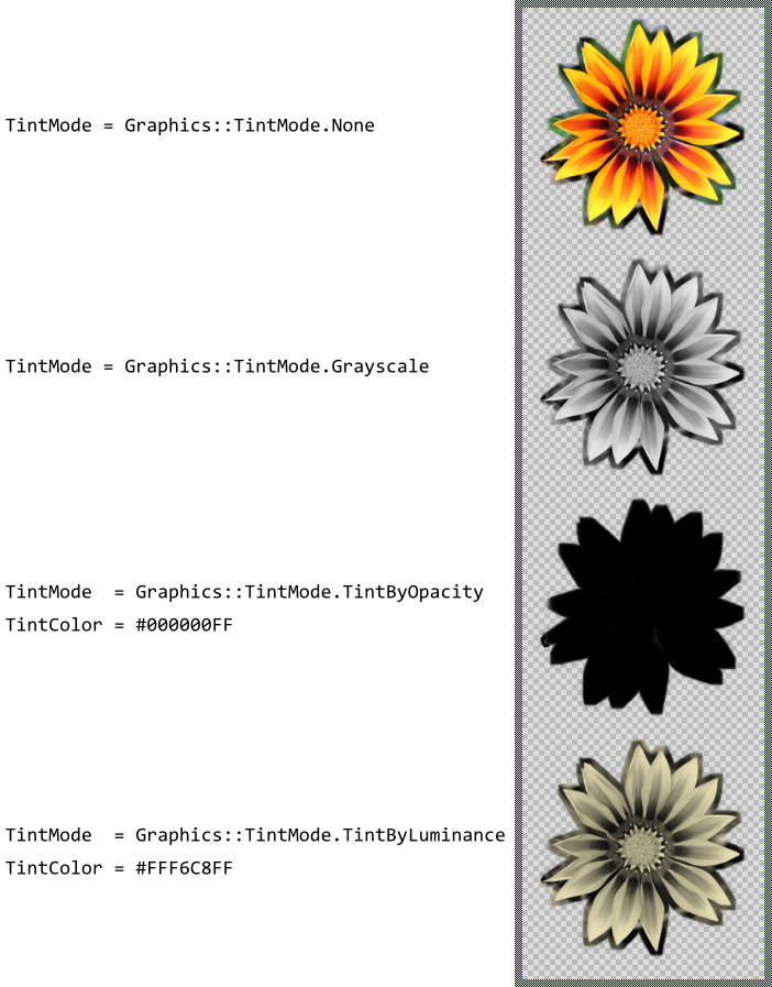 The tint filter modifies the colors found in the originally specified image content. It is controlled by the properties TintMode and TintColor where the desired conversion mode and the color to apply during the conversion are configured. The following table provides a short description of the supported tint modes (for more details see Graphics::TintMode):