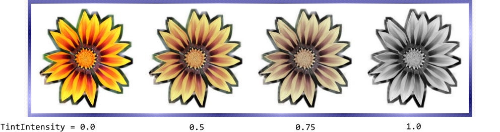 Besides the both above explained properties, the tint effect can additionally be controlled by the property TintIntensity. It determines the intensity of the tint operation and lies in the floating point range 0.0 .. 1.0. If the value is 1.0, the original image colors are completely replaced by values resulting from the tint filter. In turn, the value equal to 0.0 results in the original colors without any tinting effect. For all other values the colors are interpolated between the original and the color value resulting from the filter effect. The following figure illustrates the effect of the TintIntensity property for a Filter Image view being configured to grayscale the colors of the original image:
