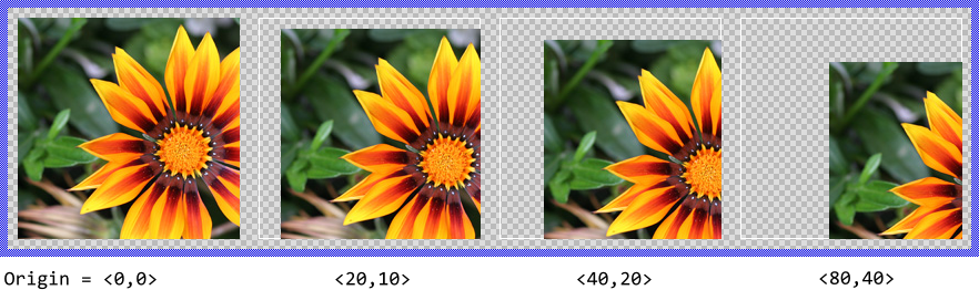 Per default, the specified bitmap is arranged and displayed directly at the top-left corner of the respective Filter Image view. To change this distance you use the property Origin. The following figure illustrates the resulting effect. When changing the property Origin, the bitmap moves within the view. Parts of the bitmap lying eventually outside the view's border are clipped and not visible. The thin borders in the figure indicate the areas of the corresponding Filter Image views:
