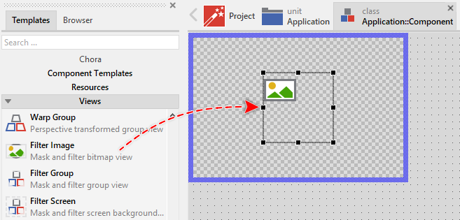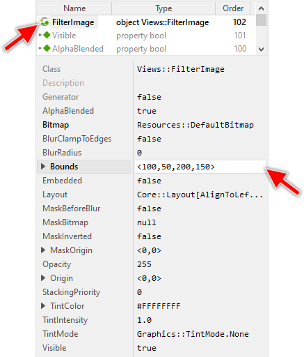 The content to display within a Filter Image view is determined by its property Bitmap. Usually, you initialize this property with the name of an existing bitmap resource member, which is typical for all immutable assets like icons, screen backgrounds and any other decorations well known already at the design time. With the Inspector Assistant you can conveniently select the right resource when you edit the initialization expression for the property Bitmap.