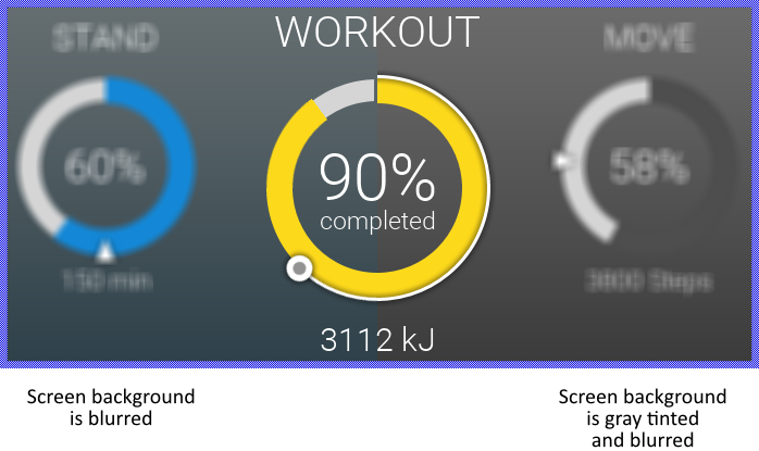 The Mosaic class Views::FilterScreen implements a graphical object specialized apply filter effects on the screen area lying behind the view. This so-called Filter Screen view can be used to compose the appearance of a GUI component, in particular to enrich the component by sophisticated filter effects, like blurring, masking or color tinting. The following screenshot demonstrates few examples of how Filter Screen views appear in the canvas area of Composer (and accordingly on the screen in your target device). The example uses the Filter Screen to blur and tint the screen background:
