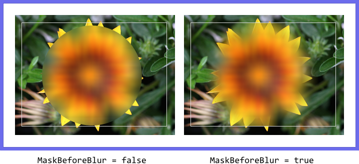 If you intend to combine the mask and the blur filter effects together, note the right order in which the effects are applied. Per default the mask effect is applied after the blur is done. Consequently, the blurred contents appear masked which results in sharp edges according to the shape of the mask. If your application case requires the image content to be masked first and then the resulting masked image being blurred, set the property MaskBeforeBlur to the value true. The following figure illustrates the different results depending on the initialization of the MaskBeforeBlur property: