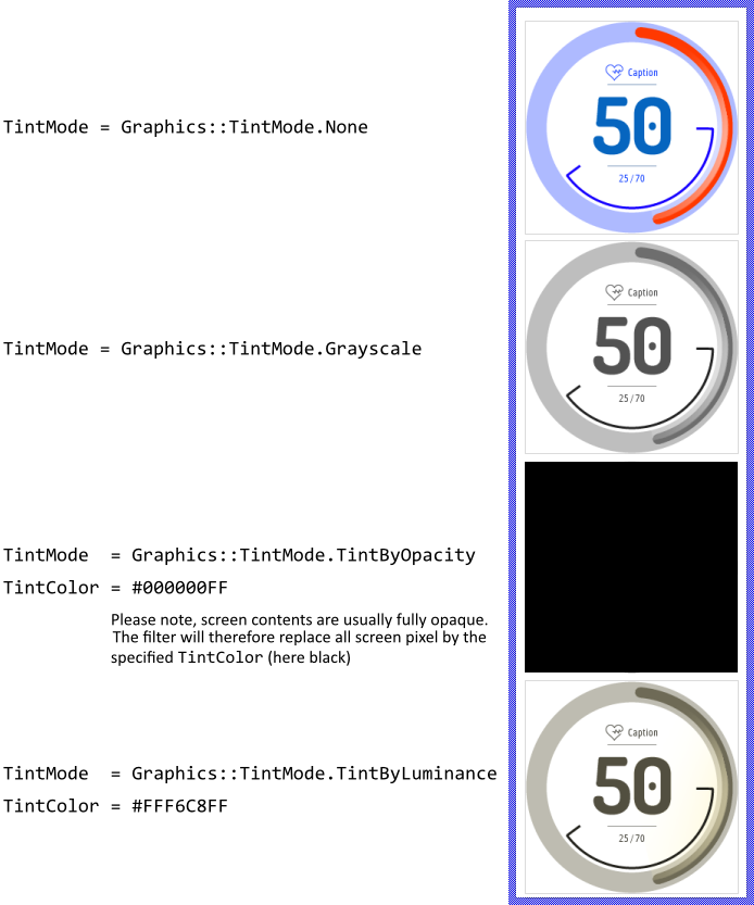The following figure demonstrates the resulting effect depending on selected tint mode and the specified color value. The thin gray borders indicate the borders of the Filter Screen views: