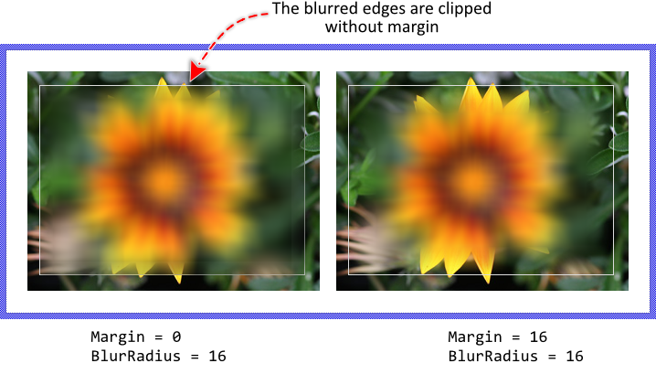 If desired, this behavior can be modified by explicitly reducing the screen area that is considered as source image by the Filter Screen view. The view calculates then with a smaller screen content and the so remaining margin can be used to fade-out the blurred contents. To control this feature the Filter Screen view provides the property Margin. Usually you configure this property with a value at least as large as the specified blur radius. The following figure demonstrates the resulting outputs. The thin borders in the figure indicate the Filter Screen views: