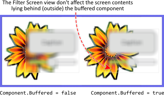 This behavior changes if one of the superior components containing the Filter Screen view has been configured as buffered. Now the effect of the Filter Screen view is restricted to the buffered component only. In other words, the Filter Screen view does not affect any contents lying behind the buffered component anymore. The following figure illustrates the different results. The thin borders indicate the components containing an embedded Filter Screen view. Since the right component is configured as buffered, its filter effects don't affect the underlying screen contents so the underlying flower image does not appear blurred: