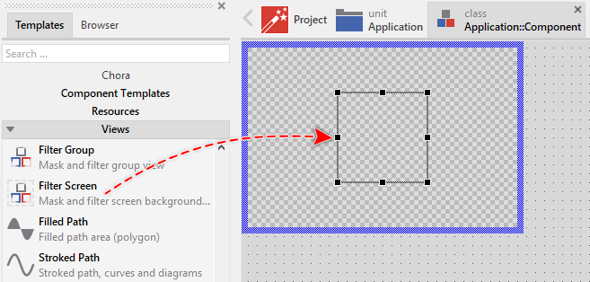 When you place a Filter Screen view inside a GUI component, this filter view will automatically affect the complete underlying screen content shining through the component. This includes also views and other components lying eventually behind (outside) the original component. The component containing the Filter Screen view acts then like a filter layer for all underlying contents. It can, for example, blur the underlying screen.