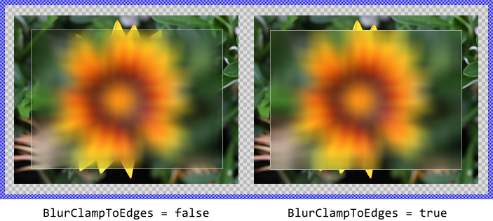 The blur filter considers pixel lying outside the source image as being transparent. In case of the Filter Screen view, the source image corresponds to the screen area enclosed precisely within the view's area. Consequently, the closer the resulting pixel to the view's edge, the more transparent pixel lying beyond the borders are involved in the calculation. The resulting pixel will appear faded-out. By setting the property BlurClampToEdges to the value true, the blur effect will end abruptly at the view's edges ignoring the transparent pixel lying outside its area. Thereupon the pixel near the borders don't appear faded-out anymore as demonstrated in the figure below. Note the pixel near the edges of the respective Filter Screen views (indicated by thin gray borders):