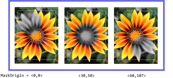 Per default, mask bitmaps are arranged directly at the top-left corner of the respective Filter Screen view. To change this distance you use the property MaskOrigin. The following figure illustrates the resulting effect using here a mask bitmap containing a simple circle with 50 pixel radius and combining the mask filter with the grayscale tint and blur filter effects. The thin gray borders in the figure indicate the areas of the corresponding Filter Screen views. When changing the property MaskOrigin, the mask moves within the view applying the tint/blur effects to the corresponding screen areas: