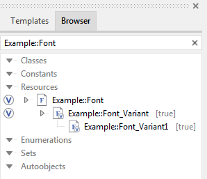 A font resource member, which has been overridden by a variant member is considered as being multi-variant. You can derive as many variants of an original member as you want. Moreover, one font resource variant can override another font resource variant resulting in a hierarchy of variants. With the Browser window you can inspect this hierarchy. Please note, a member overridden by a variant is signed in the Browser with an additional small