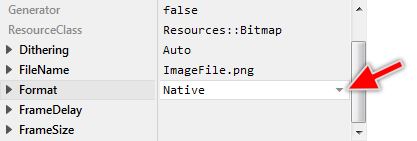 To inspect or modify the value of a Format attribute, select first the affected bitmap resource member. Thereupon, the attribute is listed in the middle area of Inspector. Please note the available assistant you can activate by clicking on the button