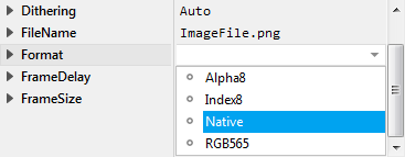 The attribute Format determines the expected pixel format of the bitmap resource. This affects the capabilities and the memory footprint of the bitmap. The following table provides an overview of the supported formats: