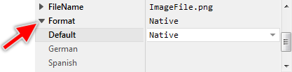 The attribute Format can be localized allowing the creation of bitmap resource members with language dependent pixel formats. For this purpose expand the attribute by clicking on the small triangle left to the attribute. All available language specific values are listed thereupon below the attribute and can be modified individually: