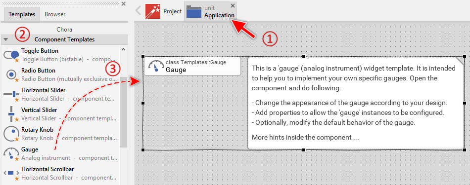 To create a new Gauge component from a template you simply Drag & Drop it between the Templates window and the Composer with an opened unit. This is important in that by using the component templates you add in fact a new class to your project. Classes, in turn, can exist within units only. The following are the typical steps to create a new Gauge component from a template: