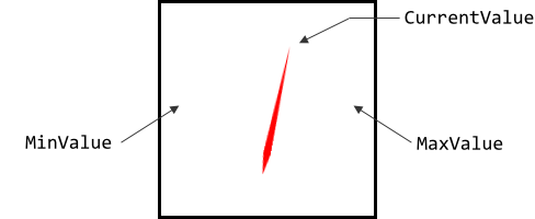 The possible value range for the property CurrentValue is determined by the both properties MinValue and MaxValue, whereby the value specified in the property MinValue corresponds to the leftmost position of the needle and the value of the property MaxValue to the rightmost position. Thus, the value of the property CurrentValue lies always between MinValue and MaxValue. The following figure demonstrates the relations between the three properties: