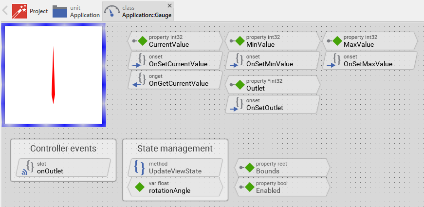 Summarized, after assigning a reference to an existing int32 property to the Gauge's own property Outlet, the widget adapts its own state to automatically correspond to the actual value of the associated property. You don't need to write a single line of code to benefit from this mechanisms. The aspects underlying this technique are explained in the sections Outlet properties and Notifications and Observer.