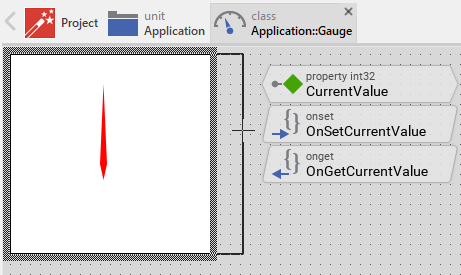 The Gauge can be connected via its property Outlet with any other int32 property the widget should remain synchronized with. When the referred property is modified by other widgets or by the application logic, the component is automatically notified to remain in sync with the property. This approach follows the model-view-controller (MVC) programming paradigm, where the Gauge has the function of the view and the property referred via Outlet serves as model. See also Outlet properties.