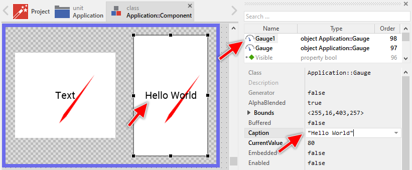 That is all. Now when you deal with instances of the Gauge component, you can evaluate and modify the properties similarly to how you access variables. Especially, when an instance is selected, you see in Inspector window the property and can change it there. The modification is immediately visible in the Composer window: