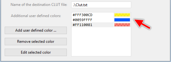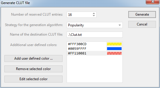 With user defined colors you can specify colors to explicitly include within the final CLUT, independent from their occurrence within the color statistic. This is intended for external GUI components depending on predefined, fixed colors.