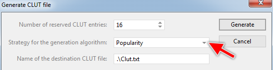 The CLUT generation is started by pressing the button . This process may take between few seconds and several minutes. The number of colors, which are reduced by the CLUT generator are reported within the Log window.