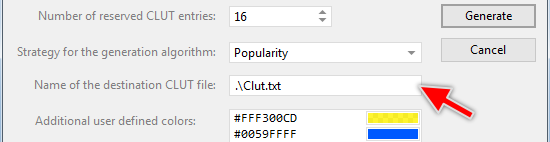 Embedded Wizard stores the generated CLUT per default in the file Clut.txt within the directory of the current project. You can however specify another name or location for the generated CLUT file.