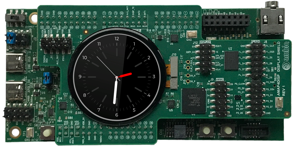 Apollo4 Plus Display Kit: Apollo4 Plus Evaluation Board (AMAP4PEVB) with round 454x454 display (AMAP4PDISP Display Shield).