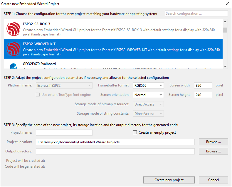 As a result you get a new Embedded Wizard project, that contains the necessary Profile attributes suitable for the ESP-WROVER-KIT: