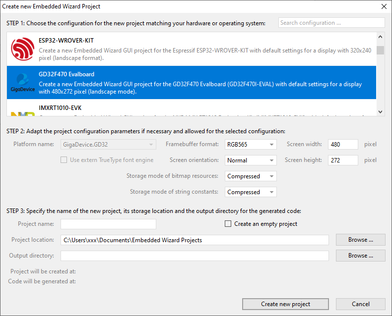 In order to create your own UI project suitable for the GD32F470 target, you can create a new project and select the GD32F470 Evalboard project template: