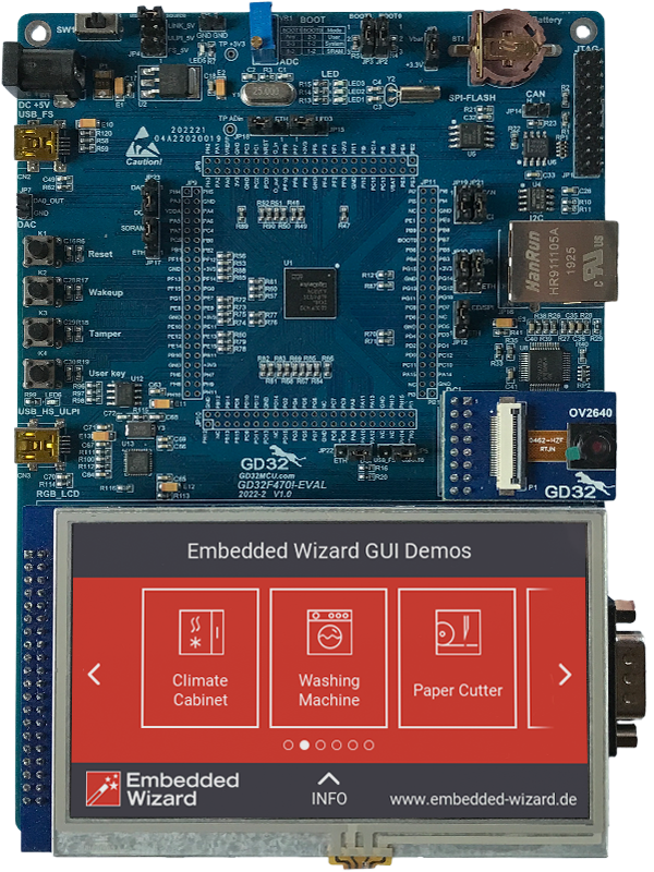 If you just want to run our GUI demos on your GD32F470 Evalboard without building the different examples, you can simply flash the binary file of the Embedded Wizard Master Demo.