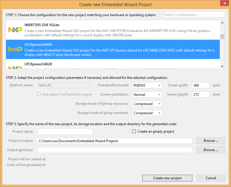 ★Screen size - If the size of your display is different compared to the display of the LPCXpresso54608 development board (480x272 pixel), please adapt the attribute ScreenSize of the UI project and the size of the framebuffer within the file ewconfig.h accordingly.
