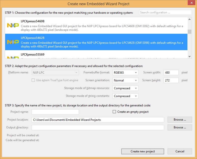 As a result you get a new Embedded Wizard project, that contains the necessary Profile attributes suitable for the LPCXpresso54628 development board: