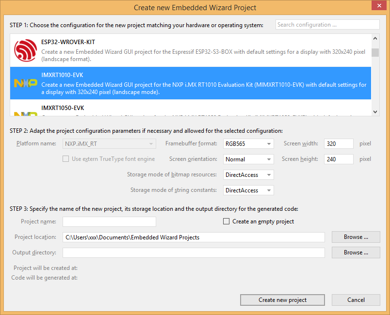 In order to create your own UI project suitable for the i.MX RT1010 target, you can create a new project and select the i.MX RT1010 Evaluation Kit project template: