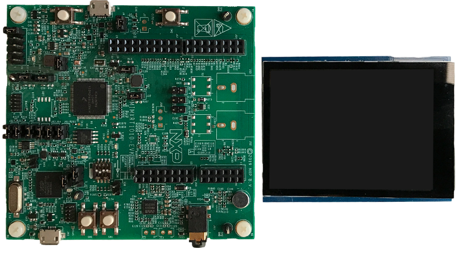 i.MX RT1010 Evaluation Kit (MIMXRT1010-EVK) and Adafruit 1947 display module with capacitive touch controller.