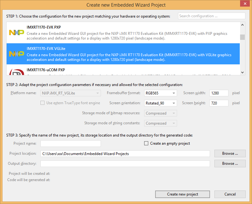 As a result you get a new Embedded Wizard project, that contains the necessary Profile attributes suitable for the MIMXRT1170-EVK development board: