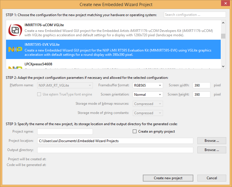 In order to create your own UI project suitable for the MIMXRT595-EVK target, you can create a new project and select the IMXRT595-EVK project template: