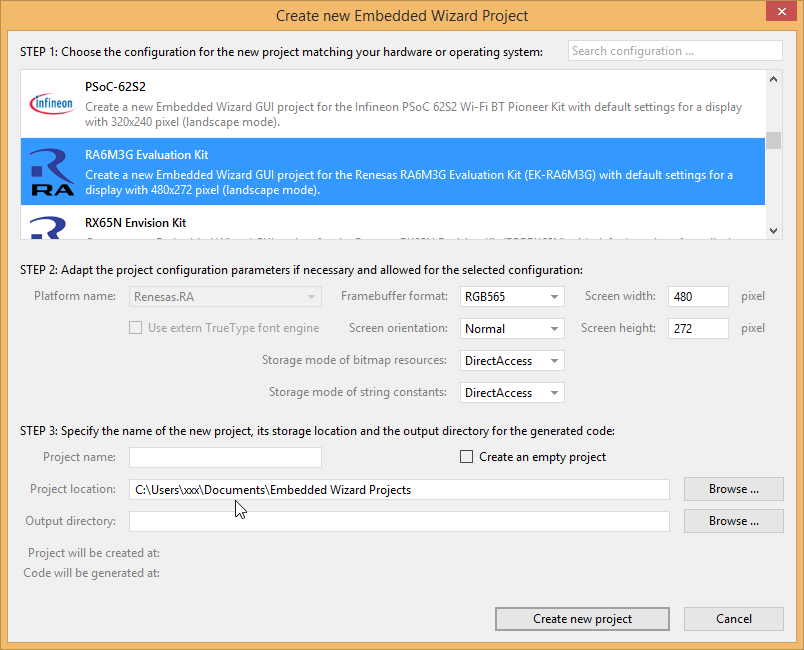 In order to create your own UI project suitable for the Renesas RA6M3G target, you can create a new project and select the RA6M3G Evaluation Kit project template: