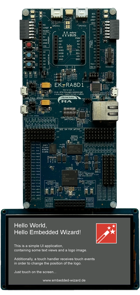 In order to bring-up an Embedded Wizard generated UI application on your Renesas RA8D1 custom hardware, you can use the provided Embedded Wizard Build Environment for RA8D1 Evaluation Kit as a template. For general information about porting Embedded Wizard to custom hardware, please refer to the article Custom Hardware Integration.