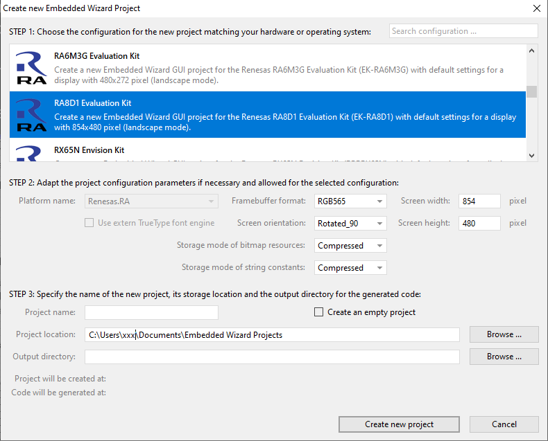In order to create your own UI project suitable for the Renesas RA8D1 target, you can create a new project and select the RA8D1 Evaluation Kit project template: